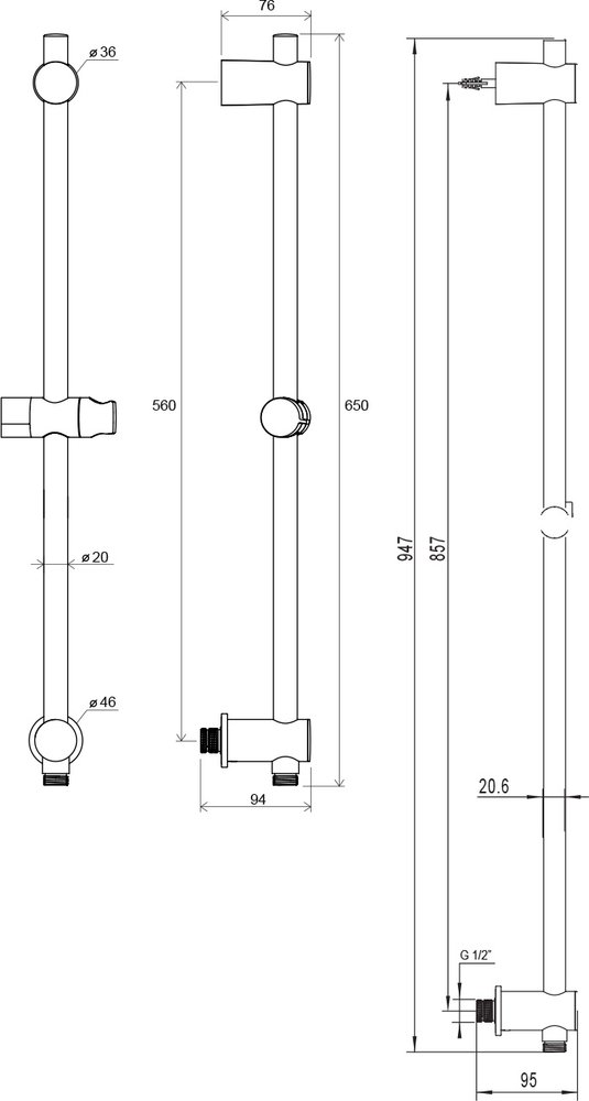 Tyč s posuvným držákem a stěnovým vývodem, 60 cm. V provedení lesklý chrom.