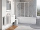 Trojdielna skladacia vaňová zástena na asymetrickú vaňu BeHappy II a obdĺžnikové vane. V bielom vyhotovení a s výplňou z nepriehľadného plastu s dekorom Rain. Otočiteľný výrobok pre ľavý aj pravý variant.