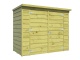 Fa kerti házikó széles, dupla ajtókkal, 203 x 103 cm méretekkel és 177 cm magassággal. A ferde tetőt tetőfedő lemez borítja.