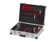 Hliníkový kufr na nářadí černo-stříbrné barvy měří 420 × 300 × 125 mm. Má možnost uzamčení a přenášení díky integrovanému madlu. Uvnitř je polstrování s nastavitelnými přihrádkami.