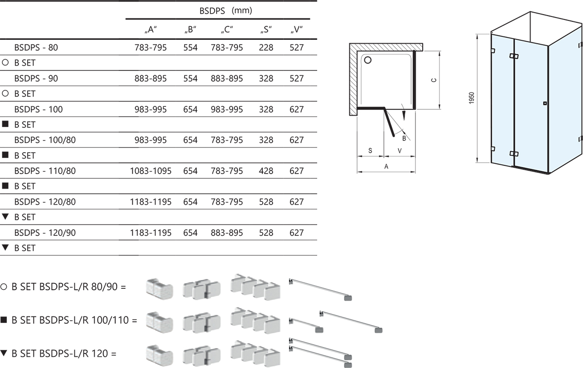 A termék egy kétrészes zuhanyajtóból (egy fix és egy mozgó résszel, amely forgóajtót alkot) és egy egyrészes fix falból áll. A termék balos vagy jobbos változatát kívülről nézve a forgóajtó zsanérjainak elhelyezkedése határozza meg. Az emelőmechanizmus biztosítja, hogy az ajtó alaphelyzetben rögzüljön, nyitáskor automatikusan bezáródjon és a küszöb fölé emelkedjen. A fürdőszoba csempézett sarkába szerelhető Ravak Gigant Pro, Gigant Pro Flat, Gigant Pro Chrome zuhanytálcákra, vagy közvetlenül a beépített lefolyócsatornával vagy padlóösszefolyóval ellátott padlóra. A BSDPS zuhanykabin a következőképpen kerül szállításra: egy üvegkabin egy csomagban. A második csomag (B SET) fém alkatrészeket tartalmaz. A termék mindkét részét külön (üveg + B SET) vagy szettben kell megrendelni.