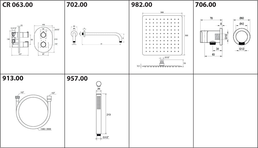 Hétrészes króm zuhanyszett rejtett termosztátos csapteleppel. Fényes króm kivitelben.