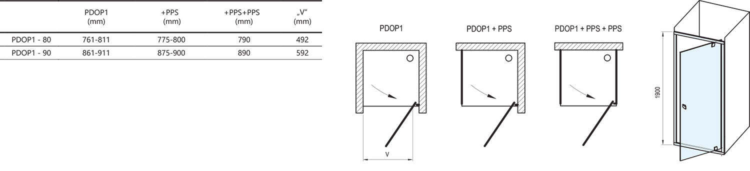 A termék egy egyenes, forgó részből áll, amely az ajtót alkotja. A termék 180°-os elforgatásával balra vagy jobbra nyitható ajtó érhető el. A fürdőszoba csempézett sarkába (ideális esetben egy falazott fülkébe vagy fix PPS fallal kombinálva) Ravak Aneta, Angela, Perseus, Perseus Pro, Perseus Pro Flat, Perseus Pro Chrome, Gigant Pro, Gigant Pro Flat, Gigant Pro Chrome zuhanytálcákra, vagy közvetlenül a beépített lefolyócsatornával vagy padlóösszefolyóval ellátott padlóra szerelhető. Két fix PPS fallal kombinálva "U" alakú zuhanykabint hozhat létre. A PNPS beállító profil segítségével a termékek 20 mm-rel meghosszabbíthatók, így tökéletesen illeszkednek az épület egyenetlenségeihez, mindkét oldalon akár 4 cm-rel.