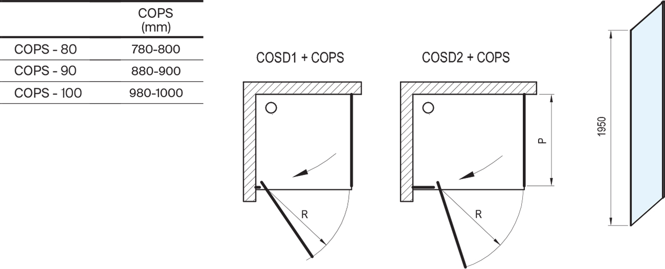 Otočením výrobku o 180° získate ľavý alebo pravý variant. Montuje sa do obloženého rohu kúpeľne a to v kombinácii s výrobkom COSD1, alebo COSD2 na vaničky Perseus Pro, Perseus Pro Chrome, Gigant Pro, Gigant Pro Flat, Gigant Pro Chrome alebo priamo na podlahu so zabudovaným odtokovým žľabom či podlahovým vpustom.