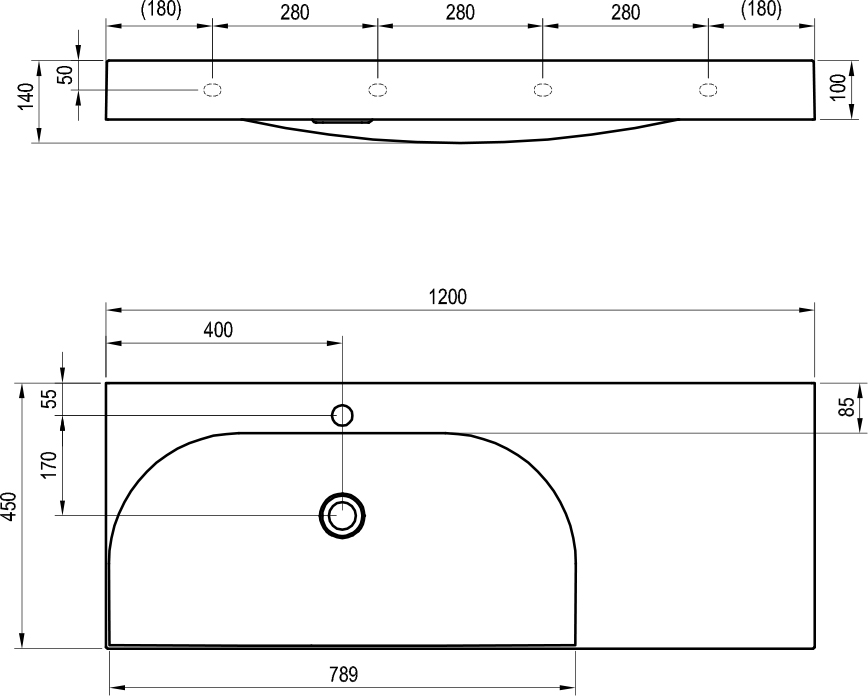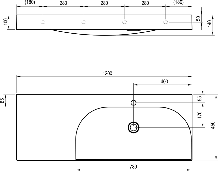 Foto - Ravak Umyvadlo Lite 120/80 P, s otvorem pro baterii, bez přepadu